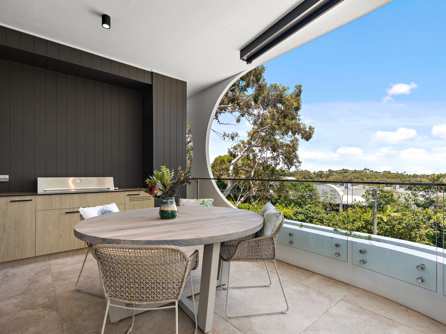Inside, the sub-penthouse apartment feels calm, elevated, and beautifully resolved. Two light-filled, cleverly separated bedrooms are thoughtfully positioned, creating an exceptional and highly functional layout. The primary bedroom features expansive oversized windows that beautifully capture natural light and endless district views, while the private ensuite, finished with floor-to-ceiling tiling and high-end fittings, is both luxurious and refined.