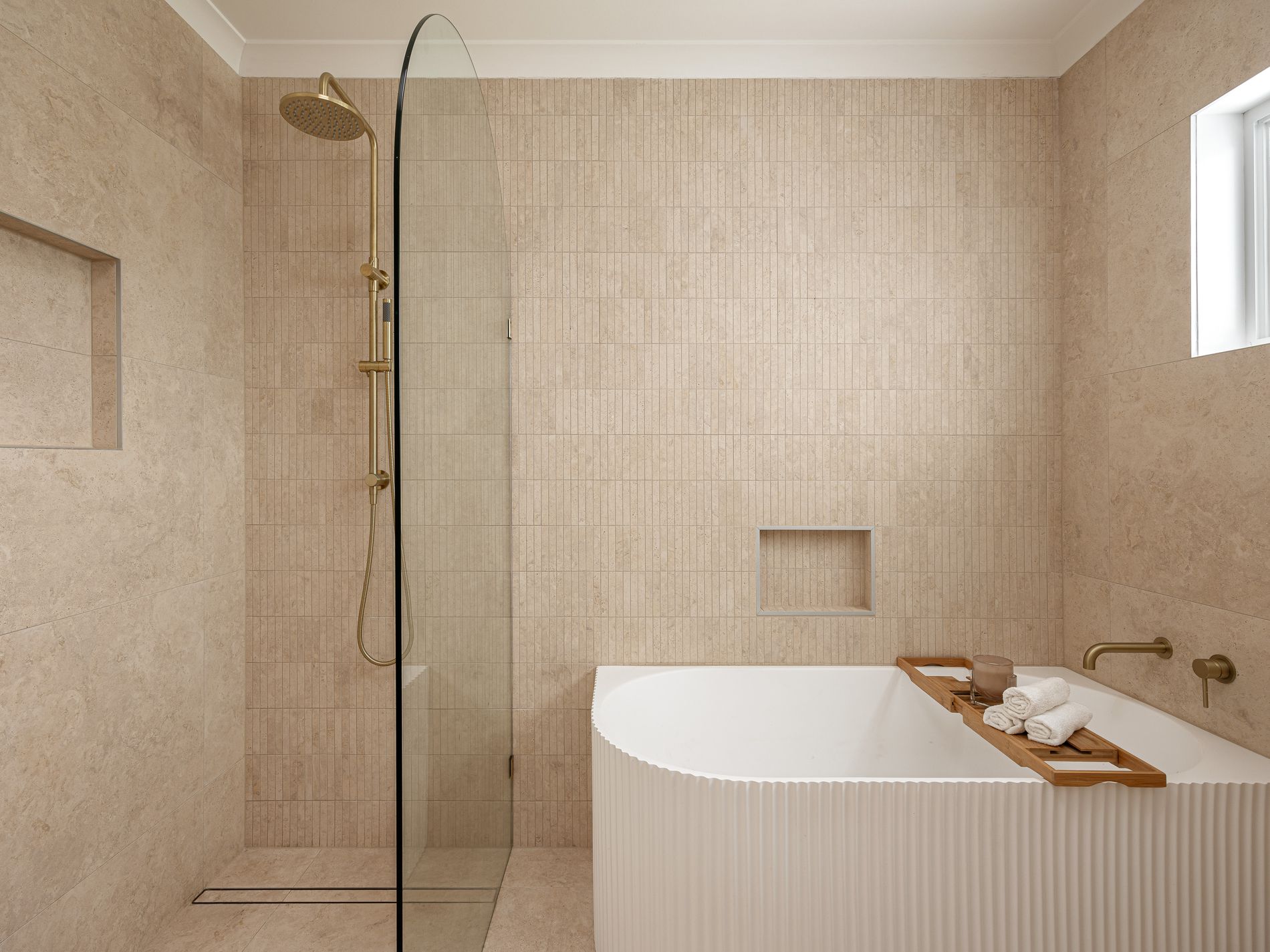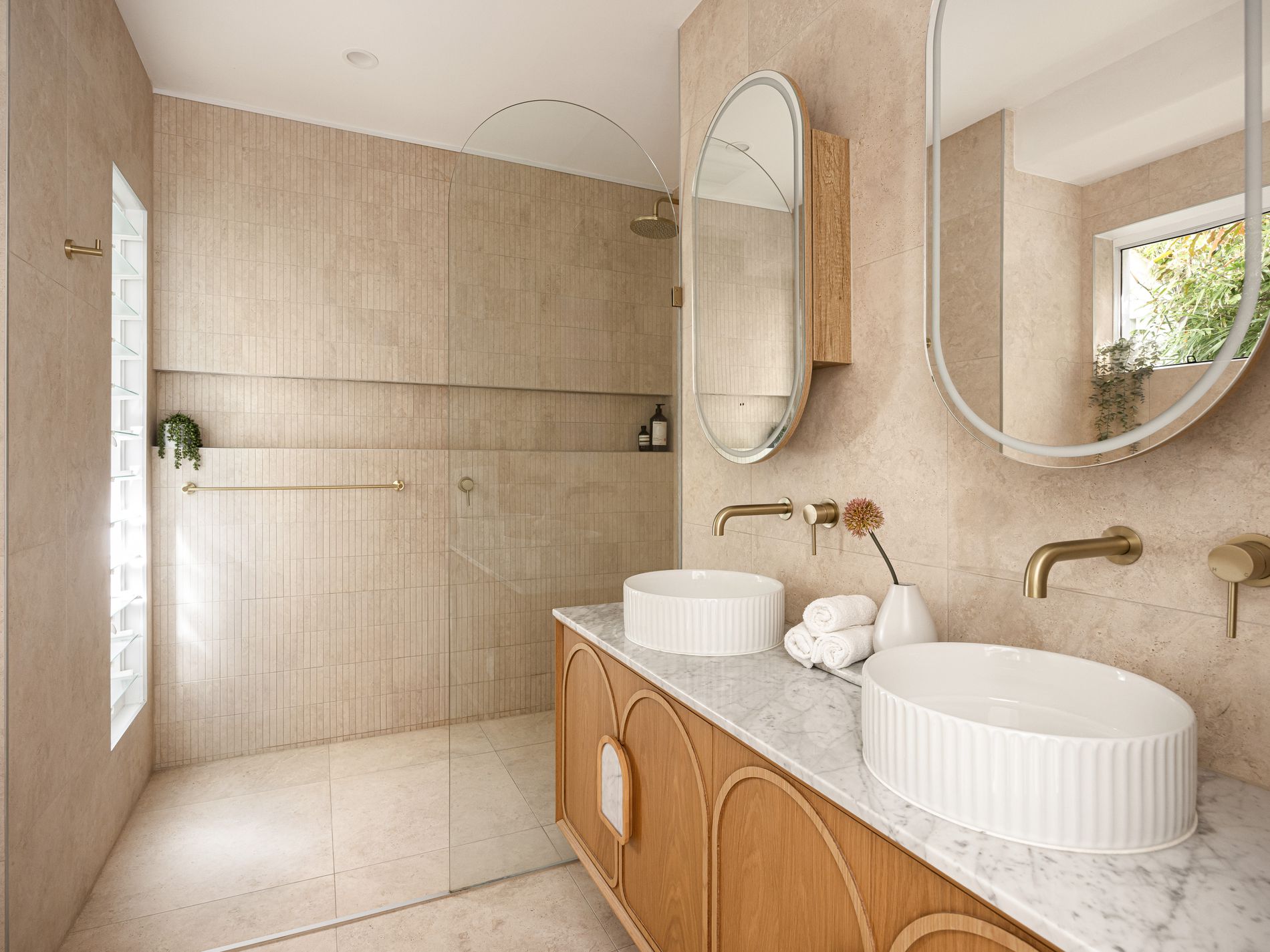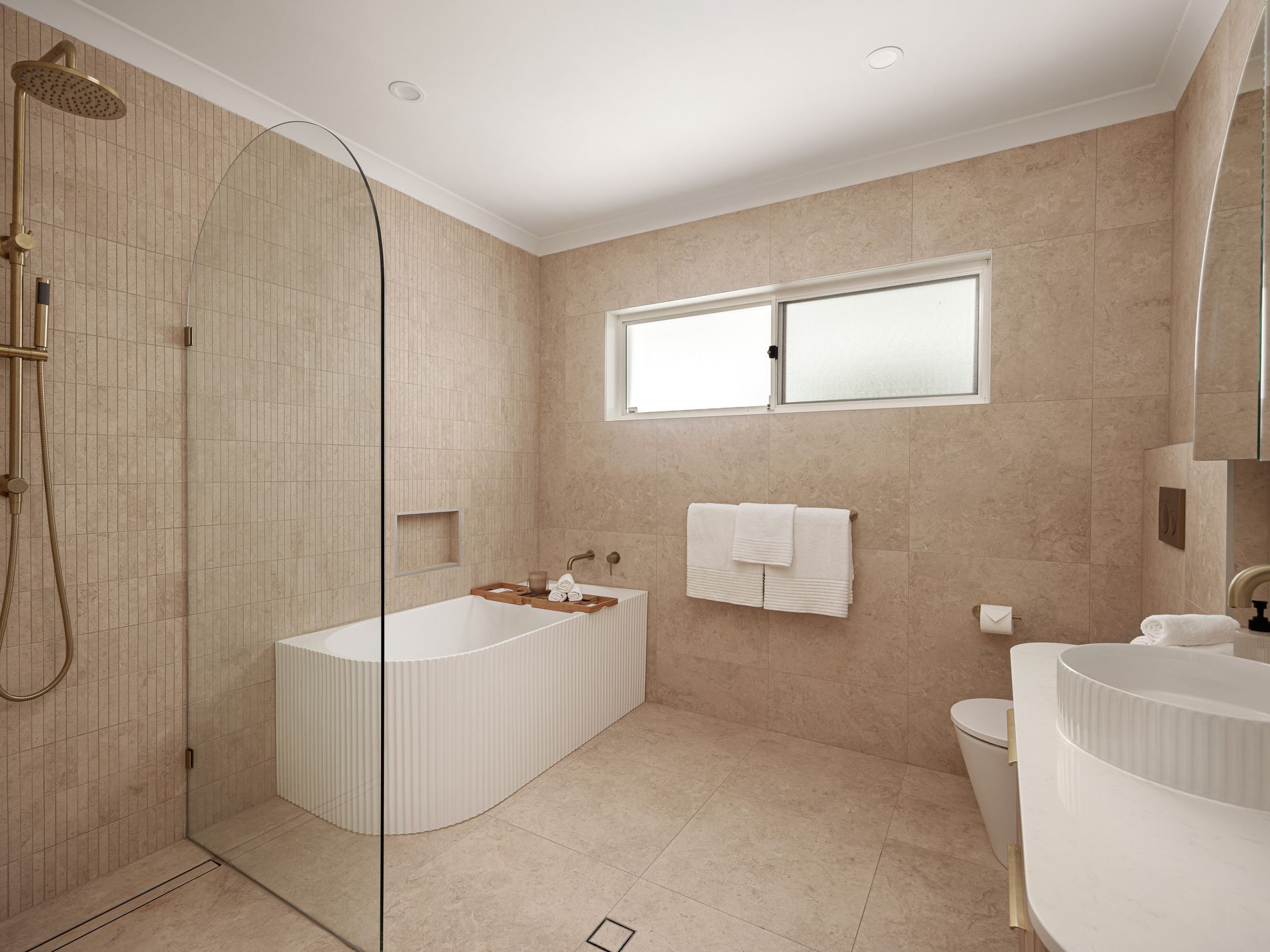 • Luxurious bathrooms with travertine and polished brass finishes